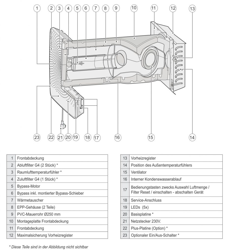 Die angesaugte Außenluft wird durch einen Standardfilter (optionaler Feinfilter) von Staubpartikeln gereinigt.